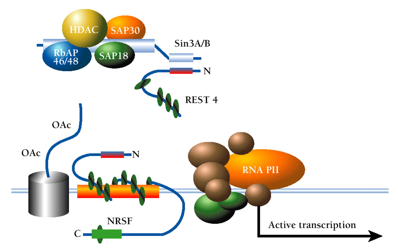 Proposed mechanism for activation of gene expression by derepression. Although NRSF is schematized to bind to the NRSE, the REST4 protein competes with NRSF for association with Sin3 corepressor complex. Thus sequestered away from interacting with NRSF, the corepressor–HDAC complex cannot remove acetyl groups (AcO) from nucleosomal core histones, and the RNA polymerase machinery (RNA PII) is thus able to form a transcriptionally active complex with the promoter.