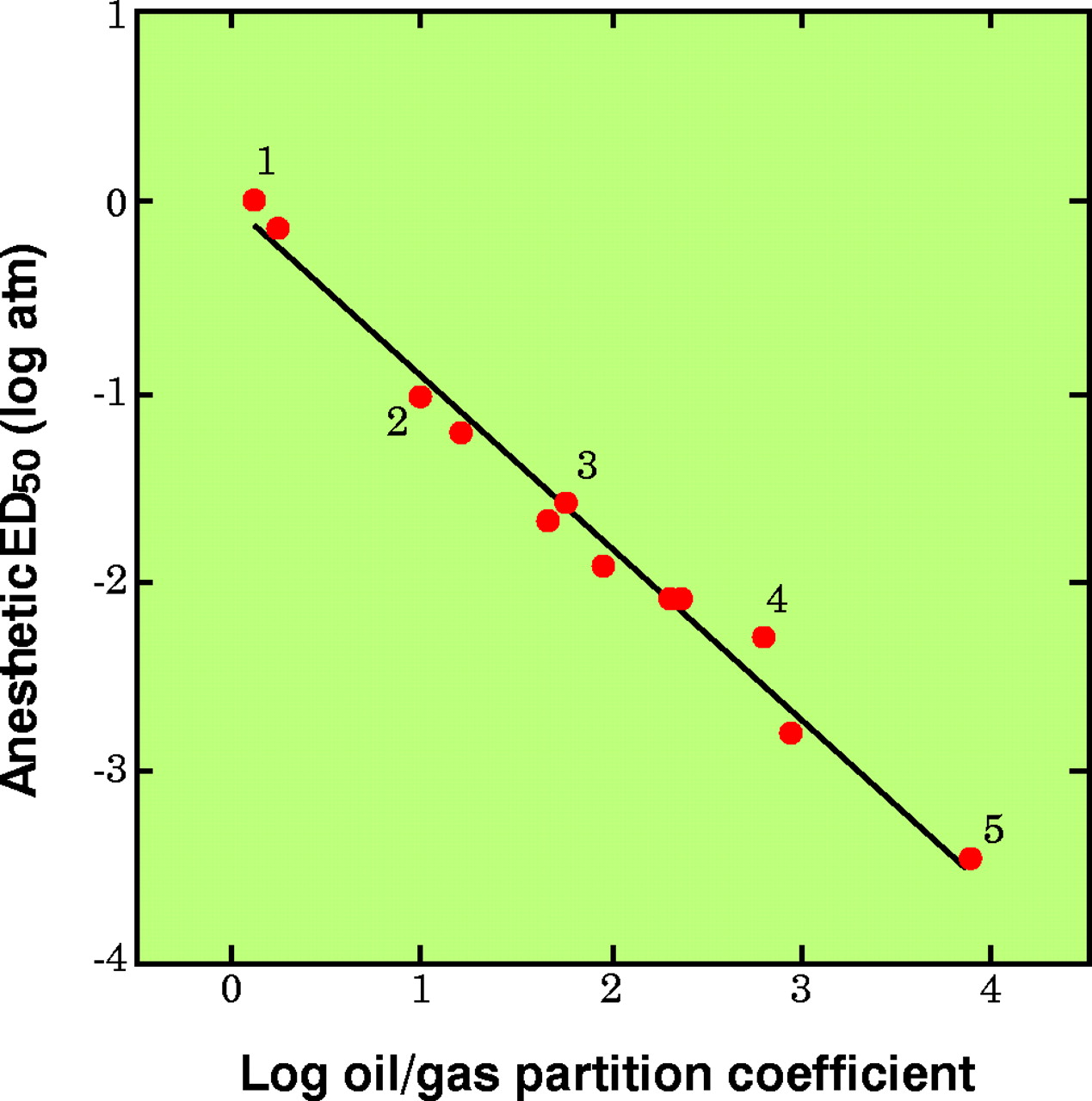 The lipophilicity of inhaled anesthetics. At the turn of the century, Meyer and Overton independently noted the strong correlation between the oil solubility of inhaled gases and their anesthetic potency. Of twelve inhaled agents analyzed, five are identified: 1, nitrous oxide; 2, cyclopropane; 3, diethyl ether; 4, trichloroethylene; 5, thiomethoxyflurane.