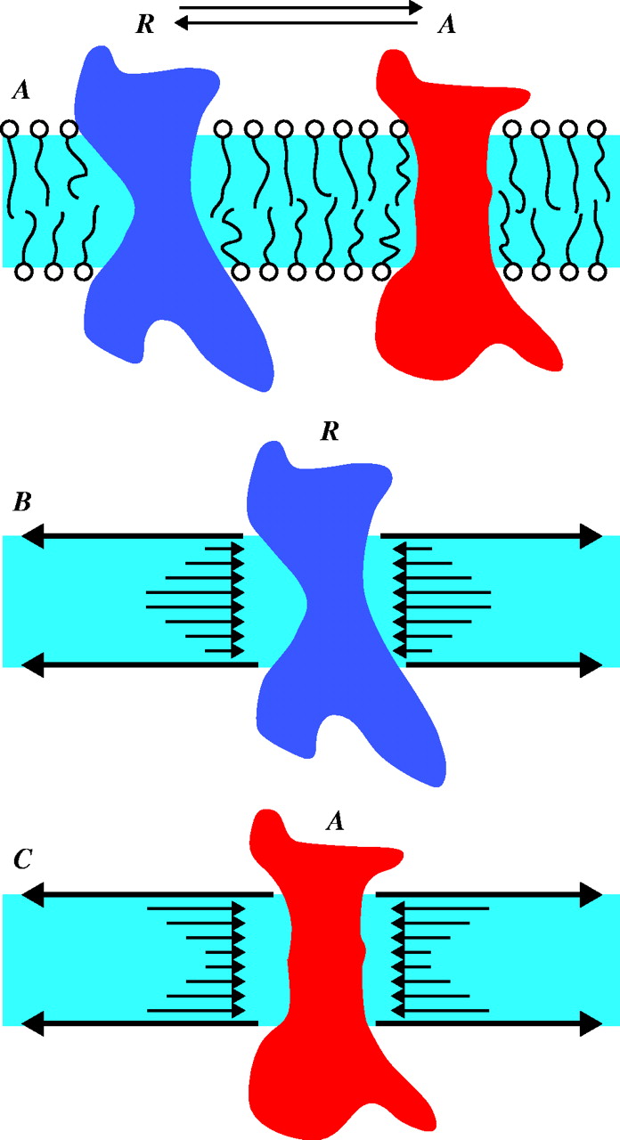 Lateral pressures within the membrane may control membrane protein conformational equilibria. Panel A shows the equilibrium between two conformational states (R for resting, and A for activated) of a hypothetical membrane protein. Panels B and C use arrows to represent the direction and magnitude of lateral pressure in a phospholipid membrane; the surface tension at the phospholipid/water interface is balanced by pressure of the opposite direction in the hydrophobic “core” of the membrane. The pressure in this core region is not constant across the bilayer; panel B shows that excess pressure in the middle will favor the R conformation of the protein, whereas the pressure profile represented in panel C will favor the A conformer. Changes in this lateral pressure profile are therefore expected to influence membrane protein conformational and insertion equilibria.
