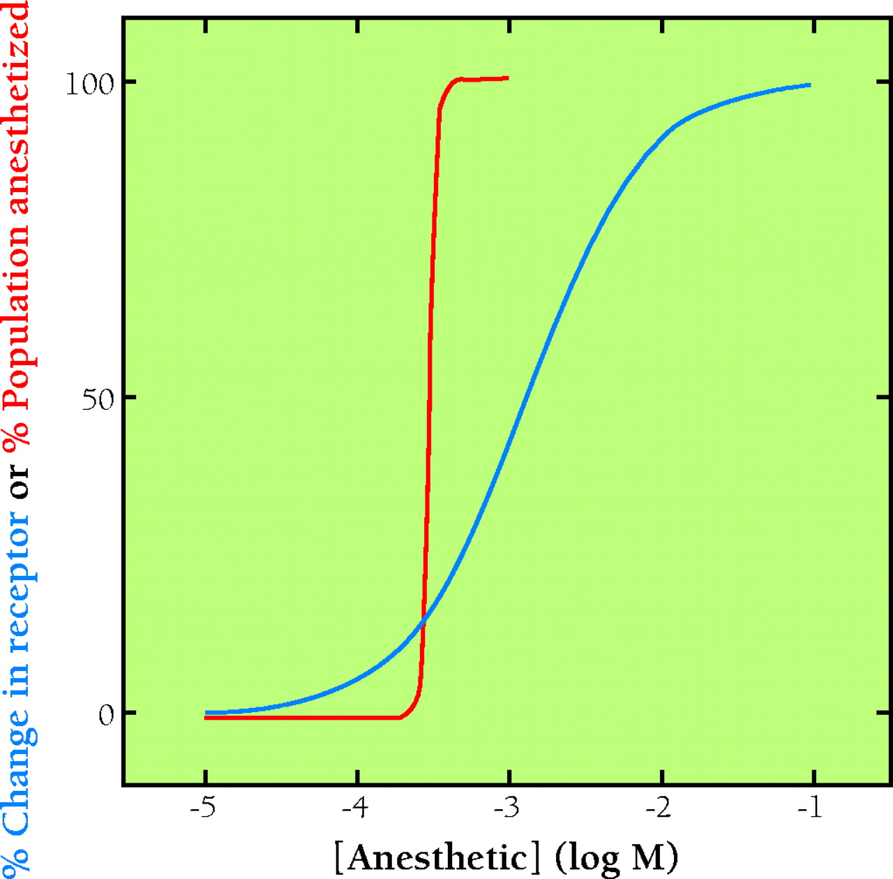 Typical dose-response curves for a) in vivo anesthesia (red), and b) a typical in vitro response to activation of a single receptor (blue). Note the much steeper curve for anesthesia (Hill coefficient ~20) as compared to a typical receptor curve (Hill coefficient of ~1). Even highly cooperative enzymes or receptors rarely show Hill coefficients greater than about 3 for ligand binding.