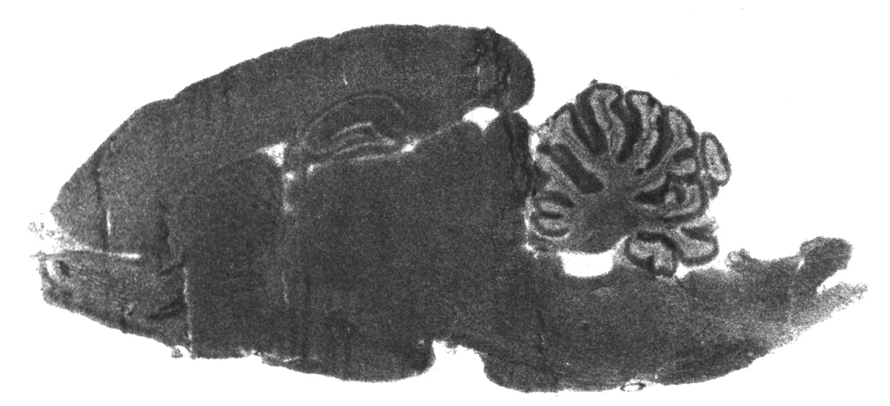 Autoradiogram of rat brain section photoaffinity labeled with radioactive halothane. Degree of halothane binding is indicated by level of darkness; no other staining has been applied to the section. The binding shows little regional preference and is reduced to near-background levels in the presence of a tenfold excess of unlabeled halothane. The dramatic inhibition of labeling by non-radioactive halothane indicates that most halothane binding is saturable and specific, showing that many proteins could be involved in anesthetic action [from (45)].