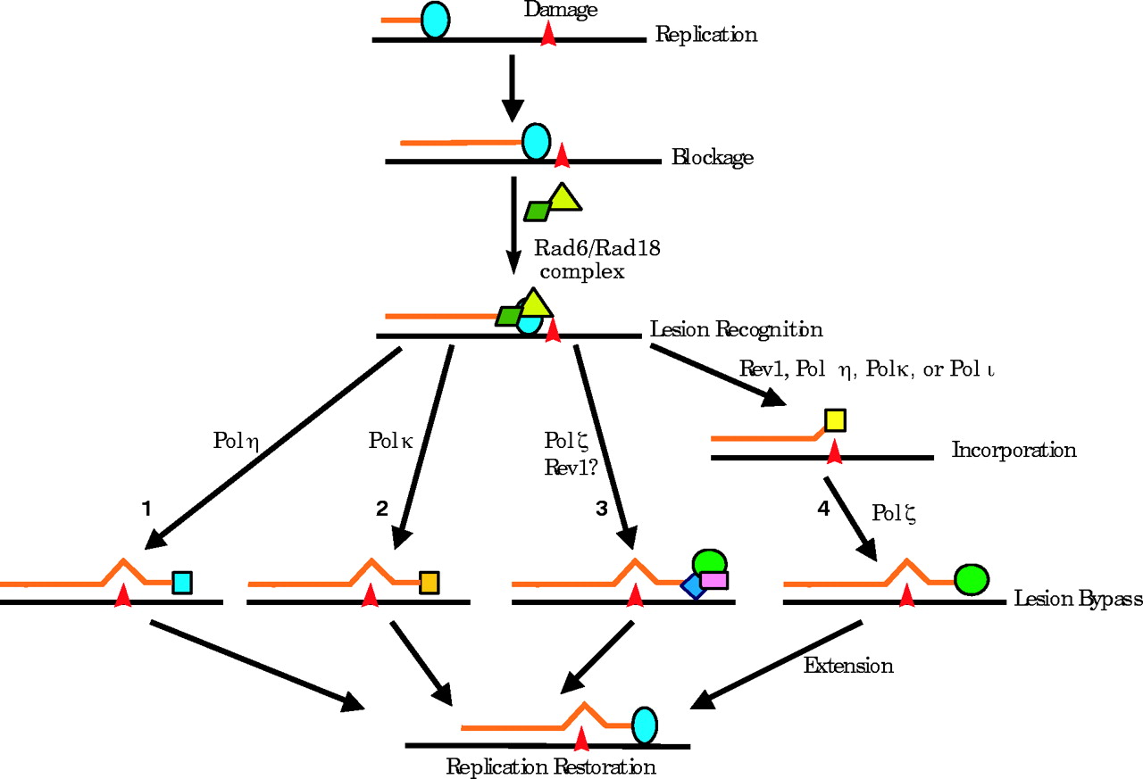 A lesion bypass model. The large oval represents replication proteins. Numbers 1–4 indicate four different lesion bypass mechanisms. The two-polymerase two-step hypothesis for lesion bypass is depicted as mechanism 4, and the Pol ζ dual-function hypothesis is illustrated in mechanisms 3. Squares in mechanisms 1 and 2, Polη and Polκ, respectively; green oval in mechanisms 3 and 4, Polζ; rectangle and diamond in mechanism 3, putative accessory factors of Polζ.