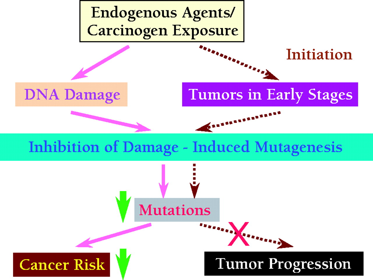 A novel strategy for cancer prevention. If the pathway(s) that underlie damage-induced mutagenesis can be inhibited by a therapeutic agent, significant decreases in cancer risk can be expected (solid line). Decreasing mutation rates could also block or slow down tumor progression, achieving cancer suppression (dashed line).