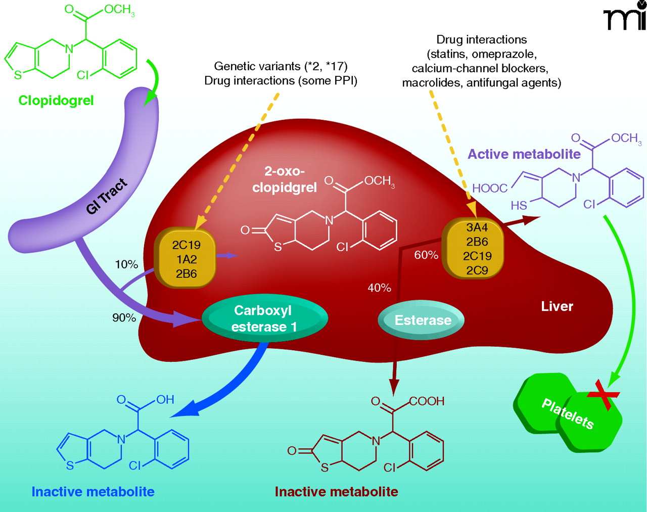 Biotransformation of clopidogrel. The cytochromes (CYPs) noted in each golden yellow box are listed in descending order of their relative contribution to the