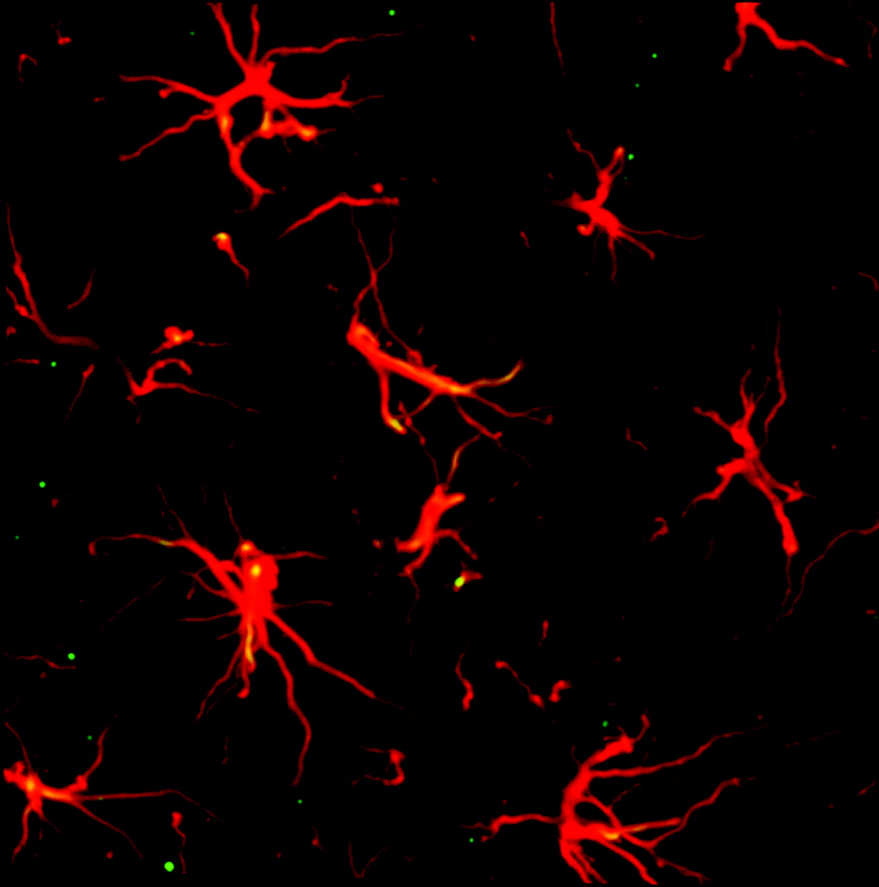 Image of astrocytes in the dorsal horn of a naïve rat spinal cord. Immunostaining of spinal cord sections to reveal astrocytes is accomplished through the use of GFAP antibody and a red fluorescent