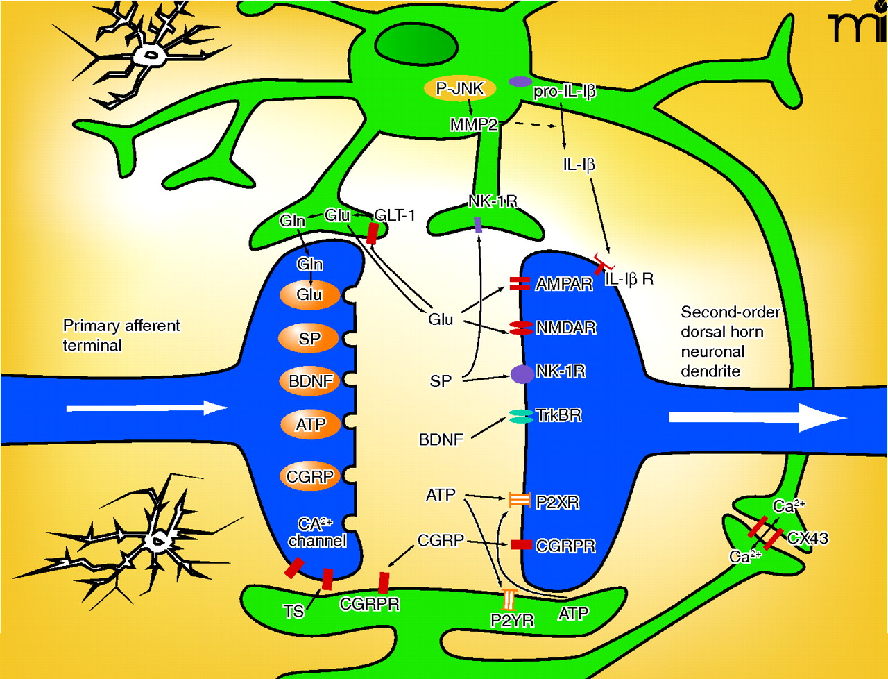 Astrocyte-mediated regulation of synaptic neurotransmission. A number of avenues have been identified whereby astrocytes can influence nociceptive signaling. Some possible targets of astrocyte-mediated control are indicated. See text for details. (AMPAR, α-amino-5-hydroxy-3methyl-4-isoxazole receptor; ATP, adenosine triphosphate; BDNF, brain derived neurotrophic factor; CGRP, calcitonin gene related peptide; CX43, connexin 43; GLT-1, glutamate transporter 1; IL-1β, interleukin 1β; MMP2, matrix metalloproteinase 2; NK-1, neurokinin-1; NMDA, N-methyl-D-aspartic acid; P-JNK, phospho-Jun N-terminal kinase; P2Y, purinergic receptor 2Y; SP, substance P; TrkBR, BDNF receptor; TS, thrombospondin.)