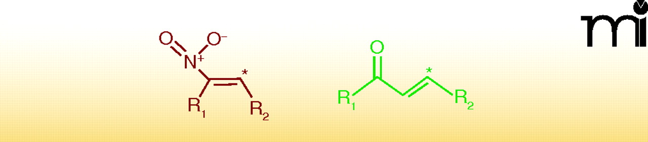 The β-carbons of nitroalkenes and α,β-unsaturated carbonyls are electrophilic. The chemical structures of a nitroalkene (left) and an α,β-unsaturated carbonyl (right) are represented above, in which “*”
