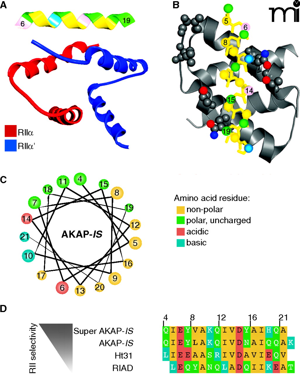 Structural aspects of AKAP interactions with the regulatory subunits of PKA. A. Structure of AKAP-IS in complex with the RII X-type 4 helix bundle. The AKAP-IS helix (top) interacts with the dimerization/docking (D/D) domain of RII through interactions within the core hydrophobic interface (yellow), and polar contacts that form hydrogen bonds with RII. B. Detailed top-view of the protein-protein interactions between AKAP-IS and RII. The residues important for AKAP-RII interactions (hydrophobic and H bonding) are numbered, with corresponding interaction sites in RII highlighted. C. Helical wheel rendering of the AKAP-IS amphipathic helix, showing a face of hydrophobic residues (yellow). D. Sequence alignment of the RII binding domain of AKAP peptides. The pdb accession number 2izx was used in A and B.