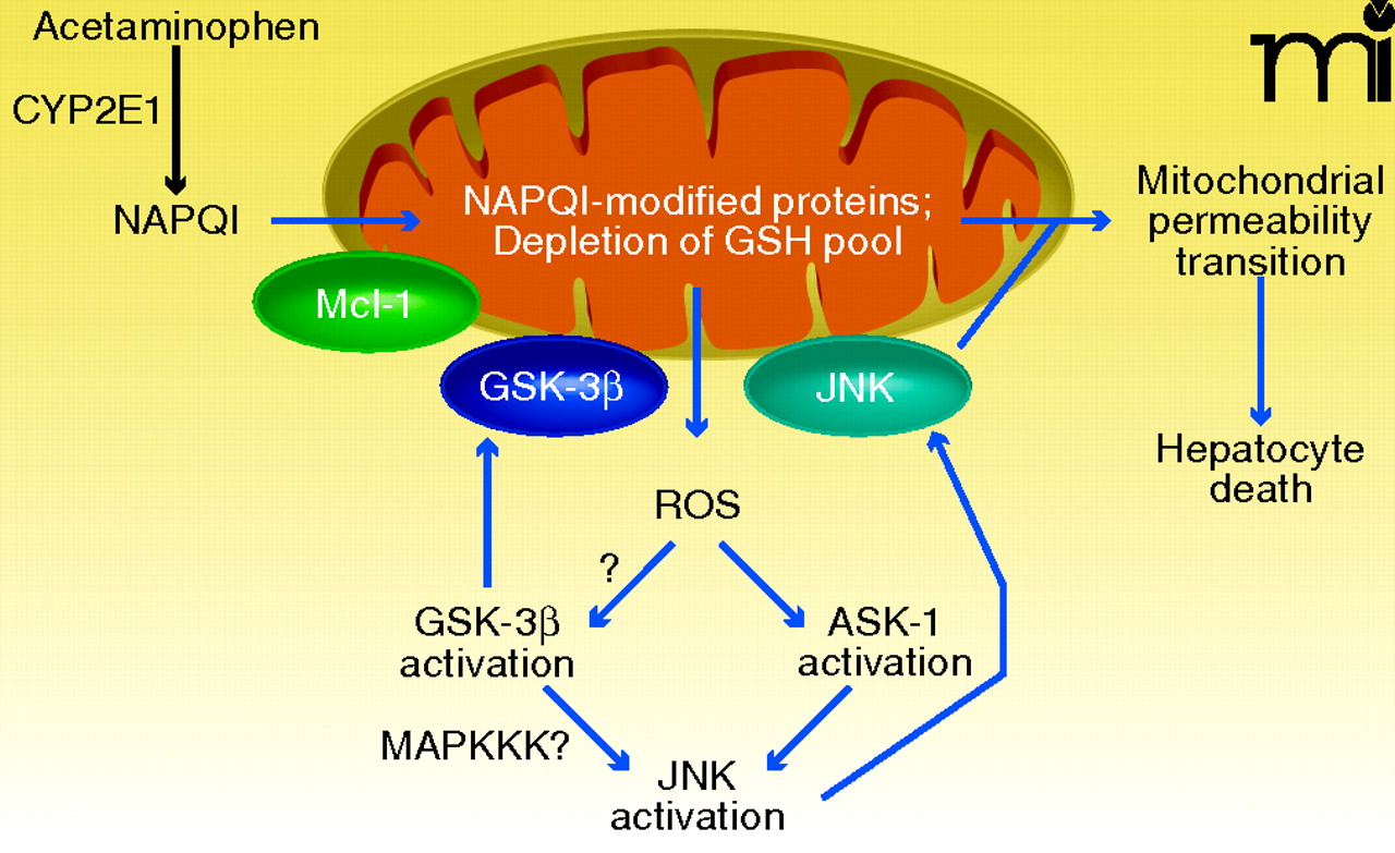 Interplay of signal transduction and mitochondria in acetamin-ophen-induced liver injury. Acetaminophen is metabolized by CYP2E1 to produce the reactive intermediate NAPQI, which modifies mitochondrial proteins and depletes mitochondrial GSH (first hit). The latter leads to increased ROS production, which activates ASK-1, thereby leading to JNK activation. Mitochondrial ROS may also be involved in GSK-3β activation, which in turn helps activate JNK, possibly through MAPKKK. Once activated, both GSK-3β and JNK translocate to mitochondria, thereby providing a sustained second hit. Mcl-1, an important anti-apoptotic protein in mitochondrial membranes, is phosphorylated by GSK-3β, which promotes its degradation. The translocation of GSK-3β and JNK to mitochondria promotes the mitochondrial permeability transition pore opening, full collapse of mitochondrial function, and hepatocyte death. See text for details.