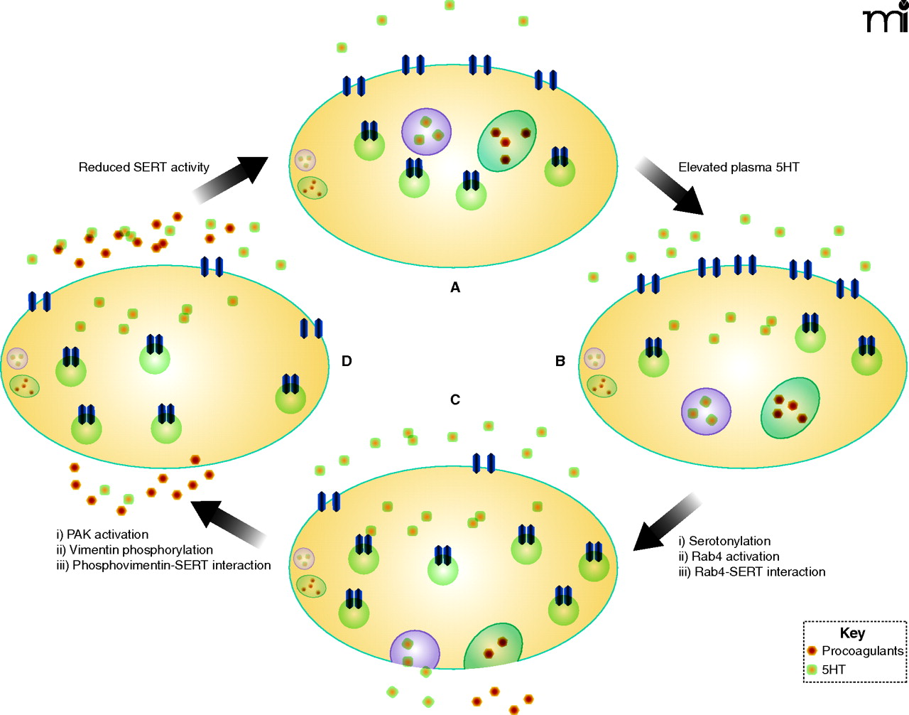 SERT-mediated 5HT uptake: reciprocal regulation of plasma 5HT levels and SERT activity in the platelet plasma membrane. Upon elevation of 5HT concentration (yellow squares) in the plasma (upper right arrow), the uptake rate of 5HT increases, as trafficking vesicles (green circles; see [A] and [B]) deliver SERT (blue geometries) to the platelet surface. The rise in cytoplasmic 5HT [B] promotes the transamination of Rab4 (not schematized), thereby activating Rab4 and promoting its association with SERT; the Rab4–SERT interaction prevents the trafficking of SERT to the plasma membrane [C]. The rise in cytoplasmic 5HT also promotes exocytosis of dense granules (purple circles) and α-granules (green ovals), the latter of which contain procoagulants (hexagons). The internalization of SERT is also promoted as 5HT activates PAK, which phosphorylates vimentin (see [C] and [D]), causing its association with SERT. The indicated roles of Rab4 and vimentin culminate in the reduced surface expression of SERT, which delimits further intake of 5HT, restoring cytoplasmic levels to their initial values (see [D] and [A]). (See text for details.)