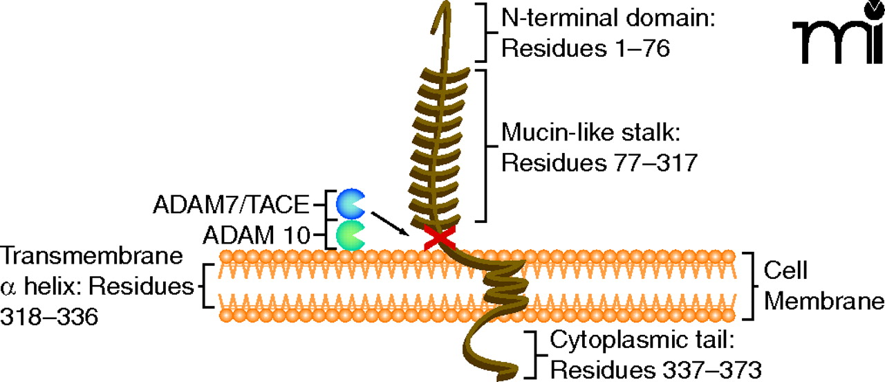 Membrane-bound fractalkine/CX3CL1. Schematic structure representation of fractalkine/CX3CL1, a membrane-bound chemokine consisting of a extracellular N-terminal domain (residues 1–76), a mucin-like stalk (residues 77–317), a transmembrane α helix (residues 318–336), and a short cytoplasmic tail (residues 337–373) (10, 57). Membrane-bound fractalkine/CX3CL1 is proteolytically cleaved by ADAM 10 and ADAM 17/TACE to generate soluble fractalkine/CX3CL1, which consists of the chemokine domain and the mucin-like stalk (11, 12, 58). The soluble form has chemoattractive activity for monocytes, natural killer cells, and T cells (9).