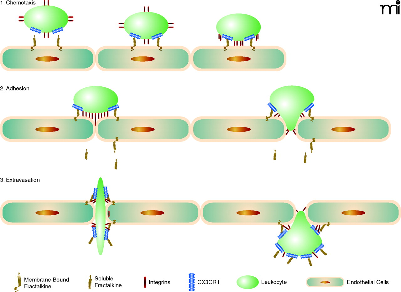 Fractalkine/CX3CL1: Sequential steps involved of chemotaxis. Schematic mechanism of fractalkine/CX3CL1 chemotaxis. When fractalkine/CX3CL1 is present, the chemokine domain is presented at the top of the membrane-bound mucin-like stalk, where it acts as an adhesion molecule. Immobilized frac-talkine/CX3CL1 exhibits rapid and high-affinity binding to CX3CR1 (10). Interaction between fractalkine/CX3CL1 and CX3CR1 can increase integrin affinity, which results in firmer adhesion (16). Soluble fractalkine/CX3CL1 binds to CX3CR1, aiding leukocyte extravasation through the vascular wall and into the tissue (10).