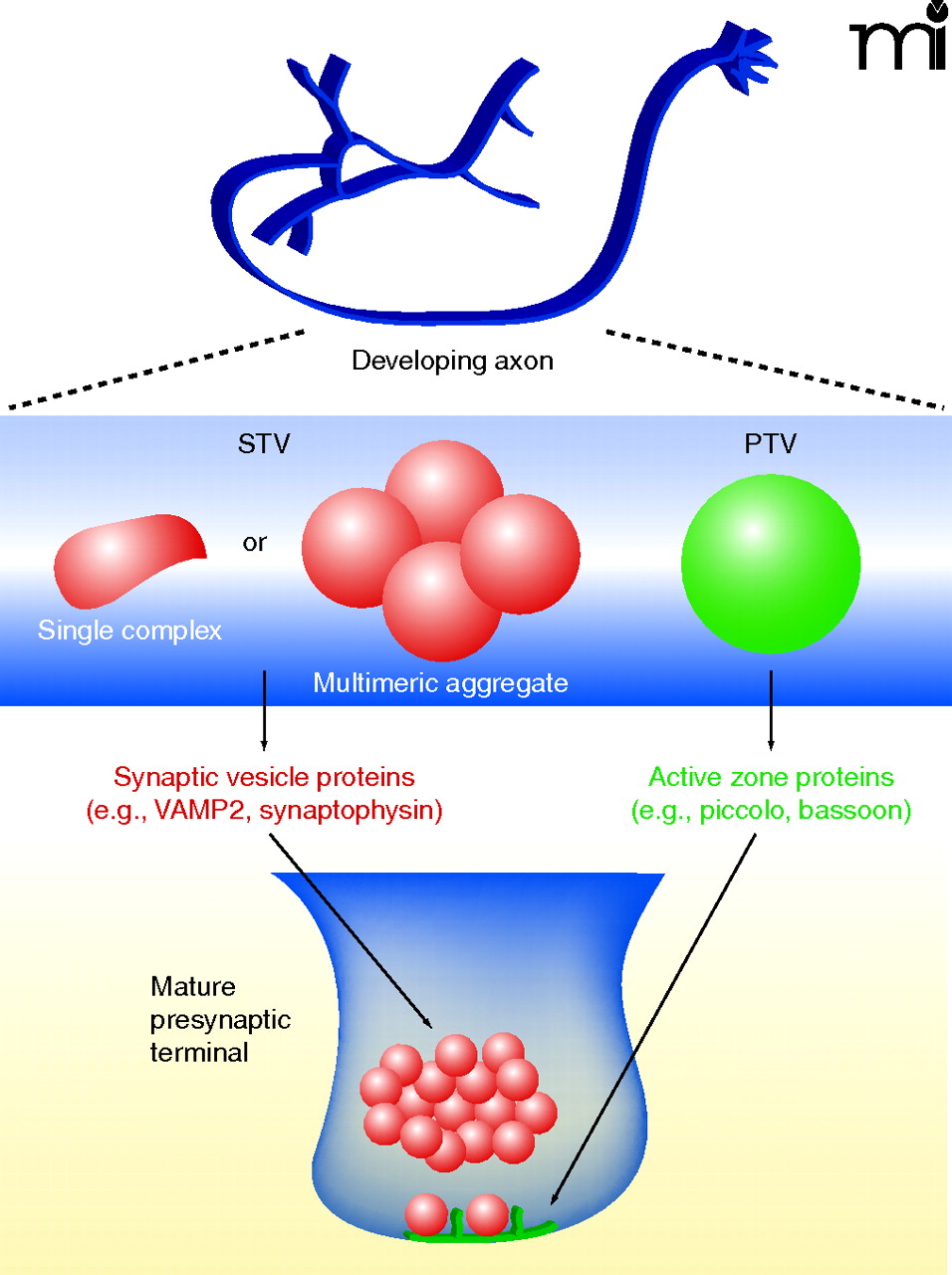 In developing axons, synaptic vesicle and active zone proteins are delivered to developing presynaptic terminals via distinct precursor organelles. Synaptic vesicle protein transport vesicles (STVs) (red) carry a variety of synaptic vesicle proteins and have morphologies ranging from tubulovesicular structures to clusters of small clear vesicles that resemble synaptic vesicles. Piccolo-bassoon transport vesicles (PTVs) (green) carry several active zone proteins and have been described as dense-core vesicles. It is not clear which cues recruit these transport intermediates to developing synapses.