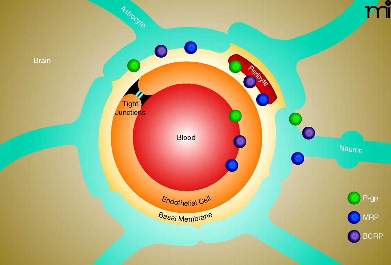 The blood-brain barrier (BBB)/neurovascular unit. The neurovascular unit comprises four cell types: capillary endothelial cells, pericytes, astrocytes, and neurons. The cells are integrated into one cell complex that controls critical BBB functions. The figure also shows the localization of the ABC drug efflux transporters P-glycoprotein (P-gp), BCRP (breast cancer resistance protein), and MRPs (multidrug resistance associated-proteins).