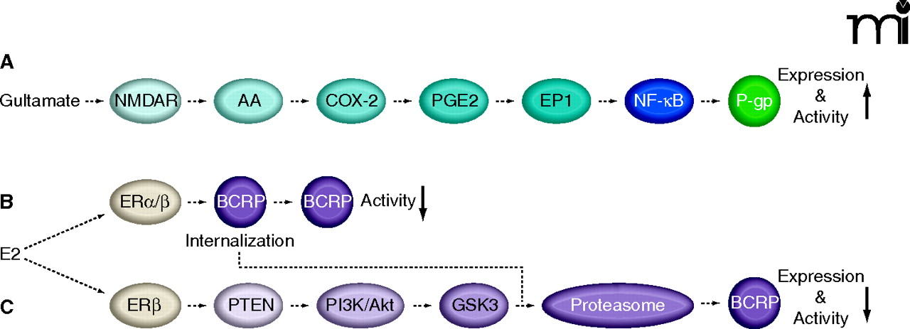 Targeting BBB ABC transporters in epilepsy and brain cancer. (A) Seizure-induced glutamate release up-regulates P-glycoprotein via a signaling pathway that involves the NMDA receptor (NMDAR), arachidonic acid (AA), cyclooxygenase-2 (COX-2), prostaglandin E2 (PGE2), the prostanoid E1 receptor (EP1), and the transcription factor NF-κB (nuclear factor-κB). E2 (17β-estradiol) signals reduction of BCRP expression (B) and its functional activity through a nongenomic signaling pathway that involves ERα/β, (C) the phosphatase and tensin homolog (PTEN, a tumor suppressor), phosphoinositide 3-kinase (PI3K), protein kinase B (Akt), glycogen synthase kinase 3 (GSK3), transporter internalization, and proteasomal degradation.