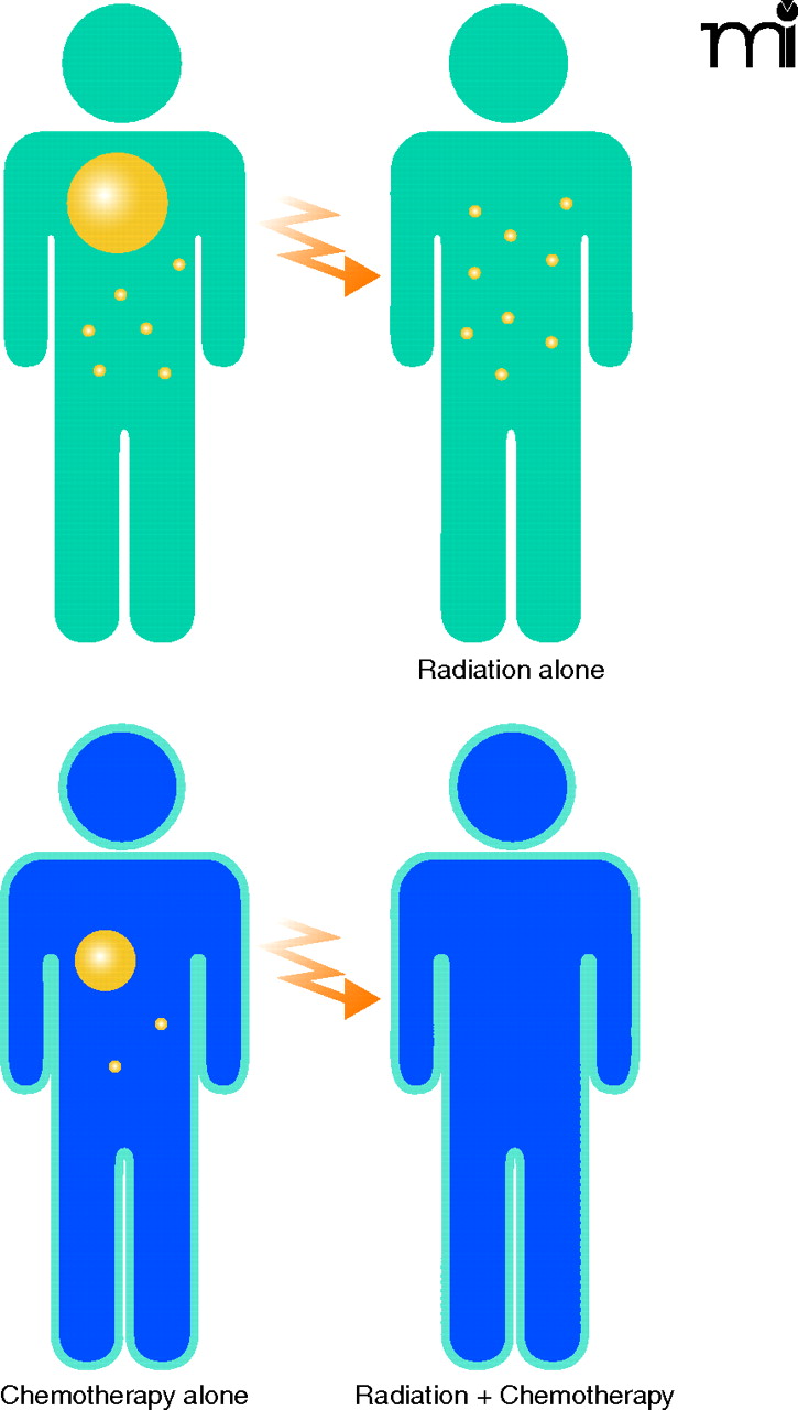 The duality of cancer and the duality of chemoradiotherapy. Most cancers require control of both local disease (large sphere) and microscopic metastatic disease (small spheres). Both radiation and chemotherapy can effectively shrink tumors. Radiation that is targeted to specific organ areas can be quite effective at eliminating disease, but it is impractical to irradiate the entire body with doses required to obliterate every cancer cell; microscopic metastases may go untreated (upper panel). In contrast, chemo-therapeutics are generally unable to eradicate primary tumors but are amenable to systemic distribution (lower left). The combination of chemotherapy and radiation is designed to improve local as well as systemic disease. The achievement of both local and systemic control is important to consider as newly developed therapies in one area (e.g., chemotherapeutics, radiation, or surgery) may affect the administration of therapies in another area.