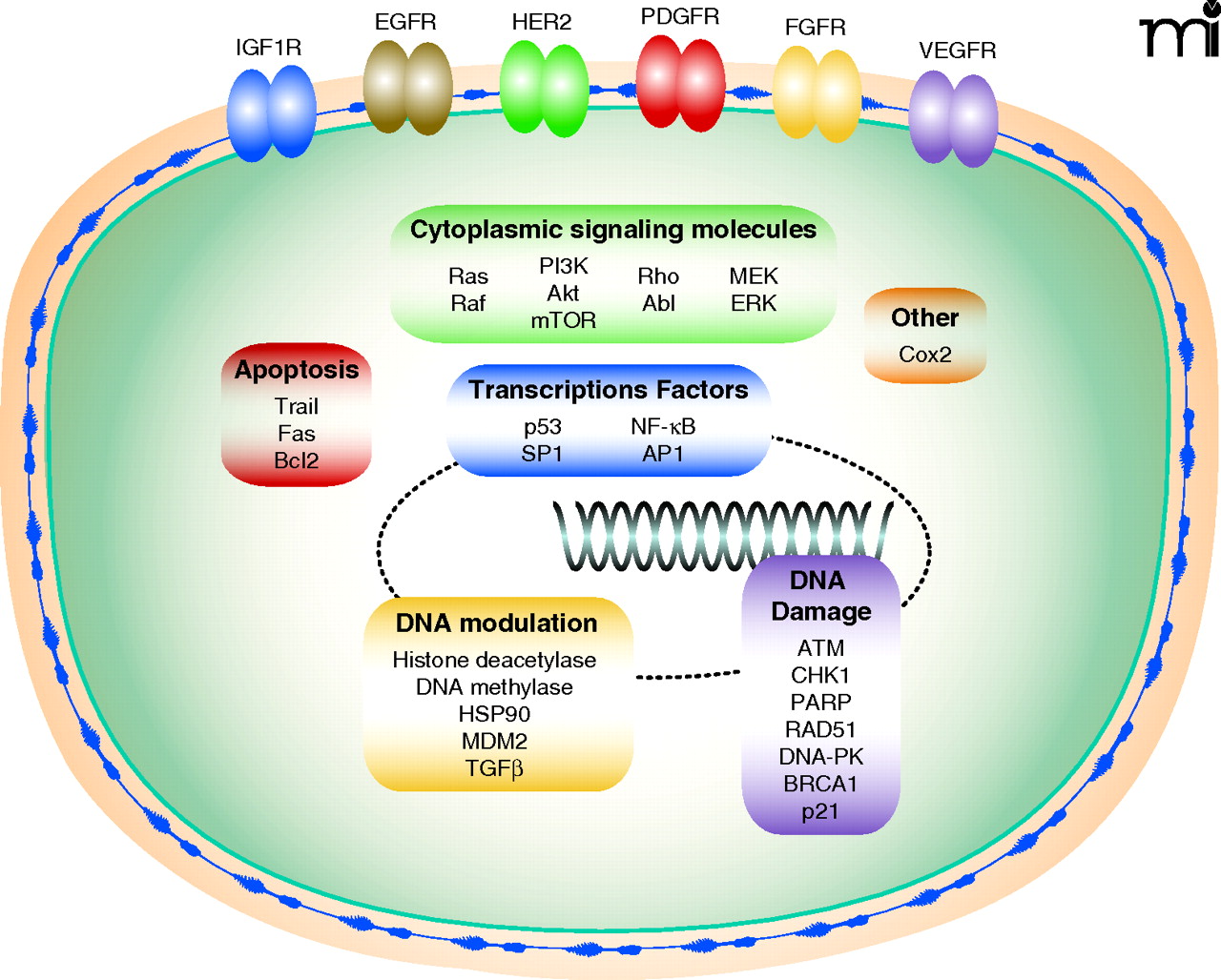 Molecular targets of radiosensitizers. Signaling molecules and pathways that have been implicated as targets in radiosensitization are schematized. See text for