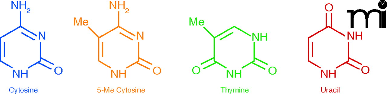 The chemical structures of cytosine, 5-methylcytosine, thymine, and uracil.