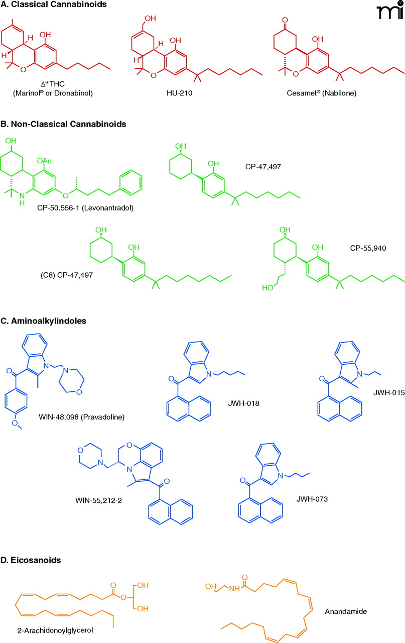 Ligands that bind to CBRs are derived from four basic structural classes: (A) classical cannabinoids, (B) nonclassical cannabinoids, (C) aminoalkylindoles, and (D) eicosanoids.