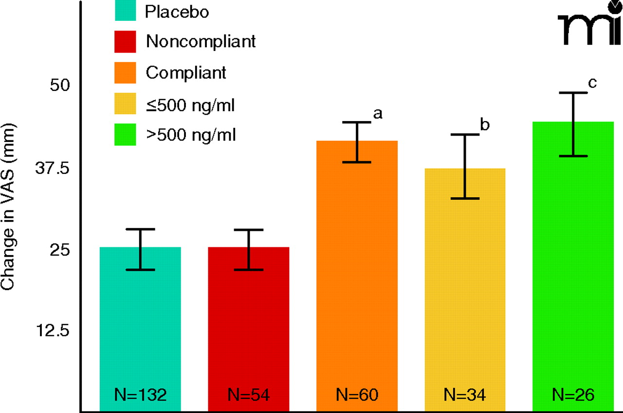 These data represent patients who received either a controlled release form of bicifadine (200 mg, twice daily) or placebo. The visual analog scale (VAS) ranges from 0 100 mm. For patient recruitment in the study reported here, baseline pain severity had to be at least 40 mm. Changes in VAS score was the primary endpoint measure; analysis of plasma bicifadine in this trial arm was a planned pharmacokinetic/pharmacodynamic comparison. VAS change scores as endpoint measures were compared with ANCOVA. Severity at baseline, gender and age were applied as covariates. The pattern of results shown here was largely replicated (data not shown) using the Roland-Morris Disability Questionnaire (15); see text for details. (ap<0.01 vs placebo or noncompliant groups; bp<0.05 vs placebo or noncompliant groups; cp<0.002 vs placebo or noncompliant groups).