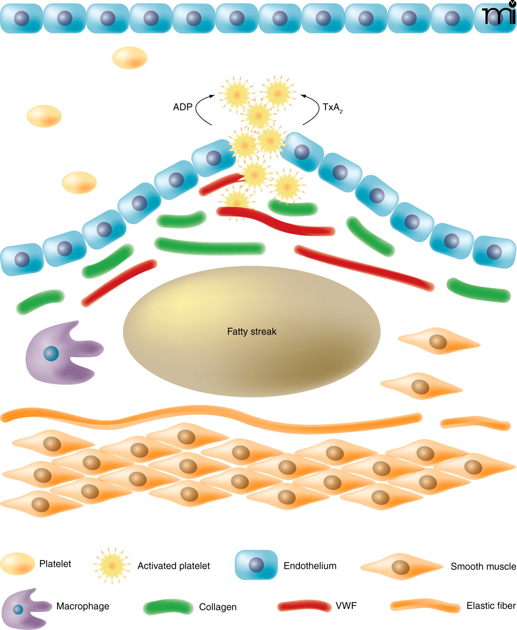 Invasion by macrophages and migration of smooth muscle cells leads to deposition of foam cells to form a fatty streak beneath the subendothelium. Rupture of this atherosclerotic plaque may ultimately occur and expose the proteins of the subendothelial matrix. Platelets adhere to von Willebrand factor (VWF) and collagen in the exposed subendothelium. The resulting platelet activation is amplified through paracrine signaling by ADP and thromboxane A2. Such signals are the target of most of the current anti-platelet drugs.