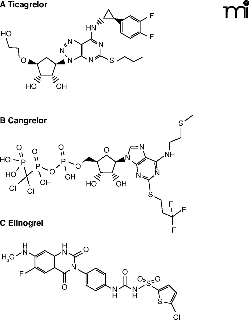 The varied structures of (A) ticagrelor, (B) cangrelor, and (C) elinogrel are shown. All three drugs share the same molecular target, the platelet P2Y12 receptor.