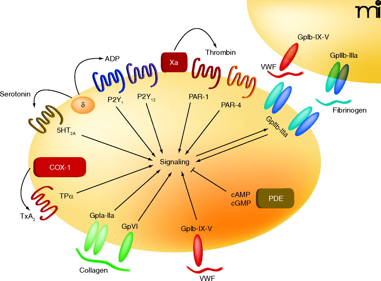 The current anti-platelet drugs target cyclo-oxygenase 1 (COX-1), the P2Y12 receptor, platelet glycoprotein IIb–IIIa (GpIIb–IIIa), and phosphodiesterase (PDE). Many of the drugs under development have new targets on the platelet, including the thromboxane A2 receptor subtype α (TPα), PAR-1 receptor for thrombin, 5-HT2A receptor for serotonin, and platelet glycoprotein Ib–IX–V (VWF receptor) and glycoprotein VI (collagen receptor).