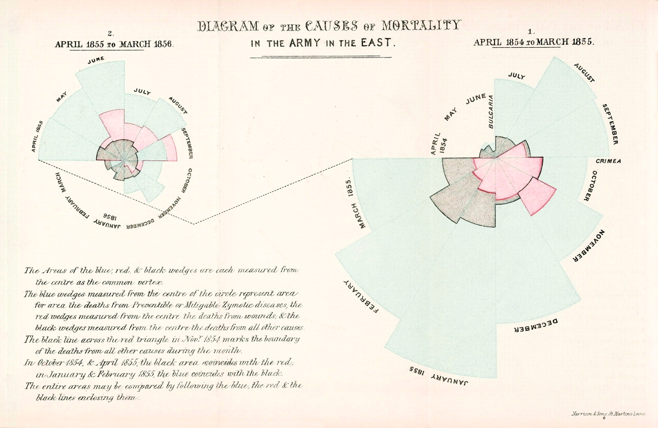 Blue wedges represent preventable deaths (infectious diseases), pink wedges represent deaths from wounds, and black wedges represent deaths from all other causes. Taken from Notes on matters affecting the health, efficiency, and hospital administration of the British Army (1858).