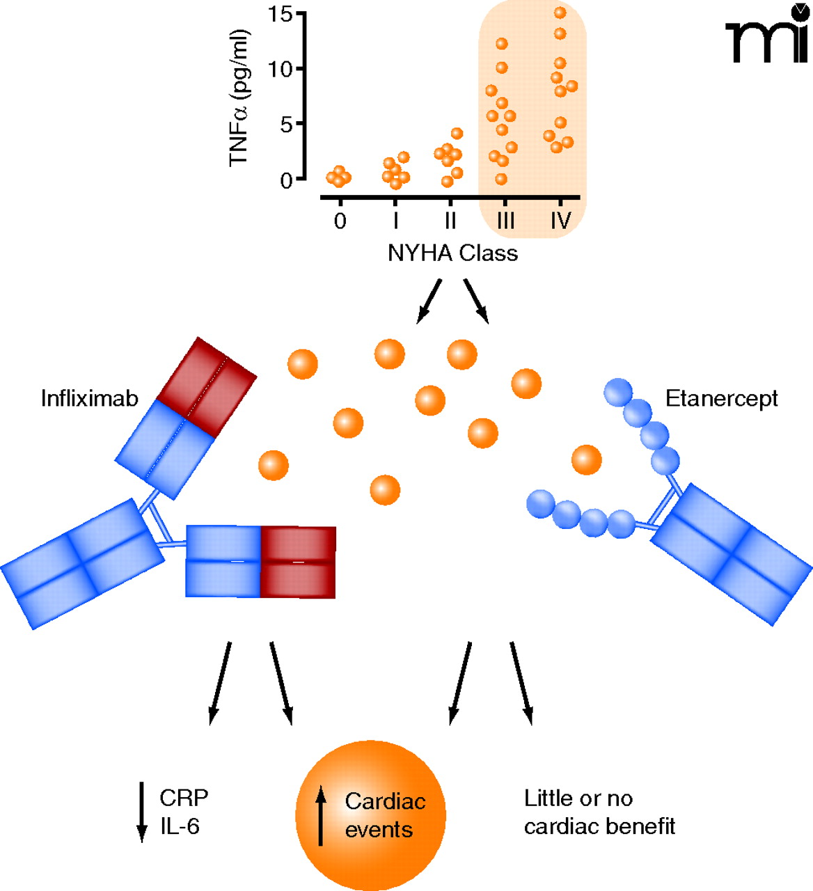 The graph in the upper section shows increasing circulating levels of TNFα in HF patients as a function of disease severity (NYHA class). The central section represents NYHA class III or IV patients that were recruited in trials that probed infliximab or etanercept. In the bottom section, infliximab decreased circulating levels of acute phase proteins (IL-6, CRP) but caused increased cardiac events, while etanercept lacked effects or caused increased cardiac events. Solid circles indicate circulating TNFα. NYHA, New York Heart Association; IL-6, interleukin 6; CRP, C–reactive protein. Based on (2, 17–19).