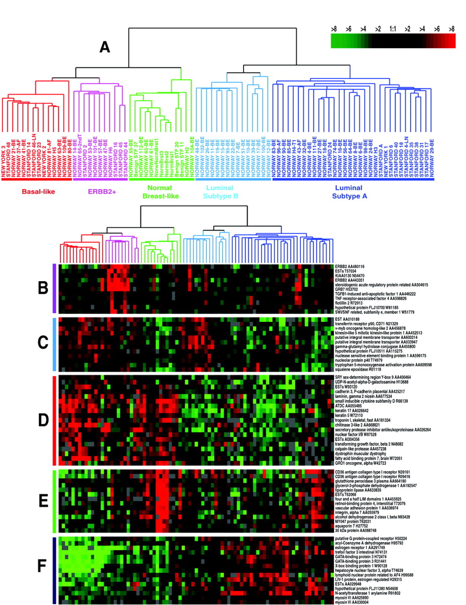 (A) Tumor clusters are represented by branched dendrograms (upper figure) that indicate degree of similarity between samples. Genes are clustered by rows according to similarity of expression. Red indicates high gene expression relative to reference; green indicates more expression in reference RNA than in tumor sample (low relative expression). Representataive gene clusters expressed by the five tumor subtypes above are shown: (B) the ERBB2 amplicon cluster; (C) genes coexpressed by the Luminal B tumors and the basal and ERBB2 tumors; (D) basal epithelial cluster containing keratins 5 and 17; (E) normal breast-like cluster; and (F) Luminal A cluster containing ER-associated genes with lower relative expression of these genes by the Luminal B tumors. [From Sorlie et al., PNAS 98: 10869–10874. Copyright (2001) National Academy of Sciences, U.S.A.]
