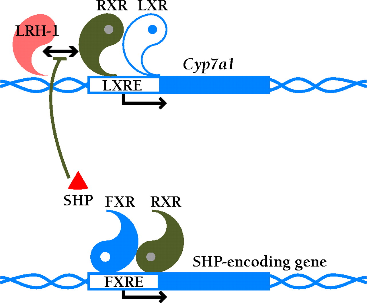 LXR and FXR as the regulatory yin and yang of intracellular cholesterol turnover. The RXR–LXR dimer becomes a functional transcription factor when either protomeric constituent binds ligand; the blue circle associated with the LXR in the schematic represents 24(S),25-epoxycholesterol. The dimer therefore binds to its cognate nucleotide sequence (i.e., the LXRE) in the promoter of Cyp7a1, a gene crucial to cholesterol catabolism. Activation of the LXRE by the dimer is enabled through an interaction with LRH-1. As cholesterol is shuttled into bile acid (represented by white circle) production, FXR becomes functional as a transcription factor in the expression of the SHP-encoding gene. SHP binds to LRH-1 and limits the effectiveness of the RXR–LXR dimer. For a list of genes that are activated by LXR, see Table 1.