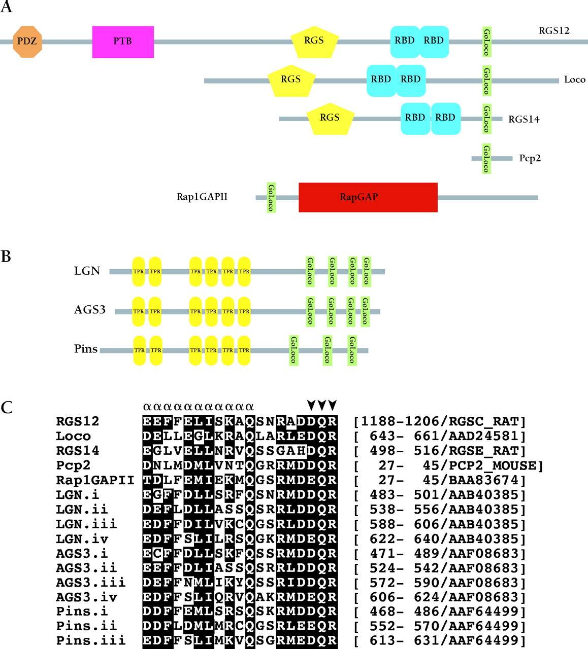 GoLoco motifs in a diverse set of signaling regulatory proteins. Domain organization of single- (A) and multi-GoLoco (B) containing proteins as described by the Simple Modular Architecture Research Tool (SMART, http://smart.embl-heidelberg.de). C. Multiple sequence alignment of the nineteen-residue core GoLoco motif from indicated proteins. Conserved residues within the motif are boxed. Residues that form the N-terminal α-helix in the RGS14 GoLoco/Gαi1 crystal structure are denoted by “α” symbols. Arrowheads denote the highly conserved Asp/Glu-Gln-Arg triad. Peptide sequences were derived from GenBank and SWISS-PROT database records as denoted on right.