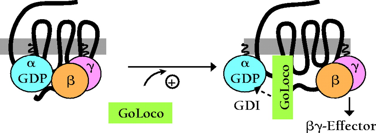 Perturbation of heterotrimeric G protein formation by GoLoco-motif peptides. Minimal peptides derived from GoLoco proteins could be used to disrupt the Gαβγ heterotrimer in the absence of GPCR activation. The binding of GoLoco peptides to Gα•GDP precludes Gβγ binding, thus allowing specific activation of Gβγ effectors without concomitant signaling from effectors modulated by Gα•GTP.