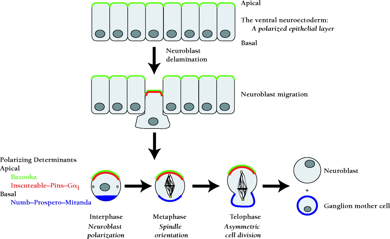Asymmetric cell division in Drosophila neuroblasts. Neuroblasts delaminate from the ventral neuroectoderm. The cell polarity of this epithelium is maintained by apical protein complexes involving Bazooka, Inscuteable, Pins, and Gαi. Basal determinant molecules such as Numb, Prospero, and Miranda are also asymmetrically localized. The mitotic spindle is reoriented into an apical-basal axis, and asymmetric cell division occurs. The resultant apical neuroblasts can undergo further asymmetric divisions, whereas the smaller basal ganglion mother cells are committed to differentiating into neurons or glia.