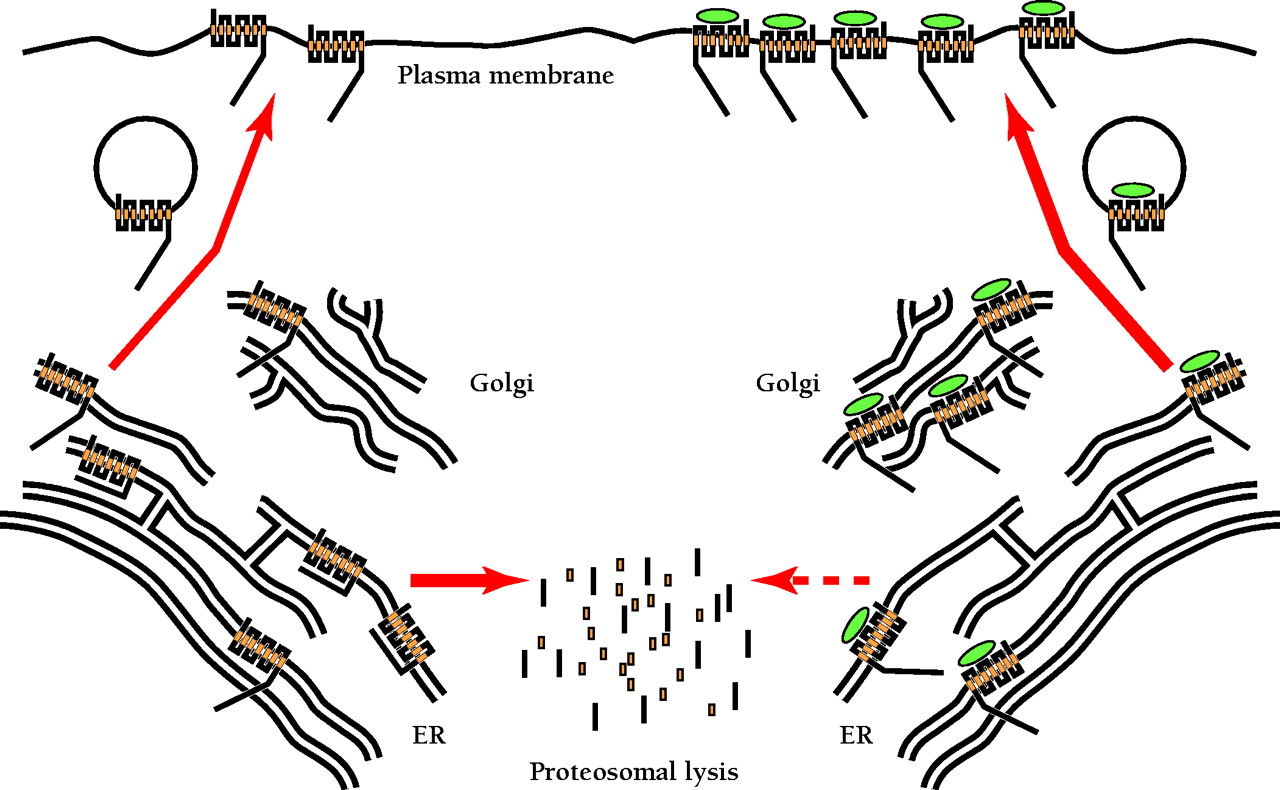 The fate of newly synthesized hδORs. On the left, receptors (represented by seven-transmembrane–spanning figures with yellow transmembrane domains) under endogenous conditions whereby only forty percent of the receptors reach the plasma membrane; the remaining sixty percent are retained in the ER, and are exported to the cytosol for proteasomal degradation. On the right, hδORs in the presence of a lipophilic hδOR ligand (represented by green-filled ovals) are processed through the ER more efficiently, so that fewer receptors are degraded and there is a concomitant increase in surface expression of receptor.