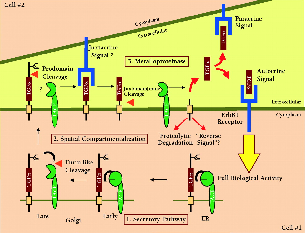 TACE-dependent proteolysis of the proTGFα extracellular domain as a regulatory event in ErbB1 receptor signaling. Genetic and biochemical data indicate that the release of soluble TGFα acting either as an autocrine or a paracrine signal is essential to achieve full biological activity in vivo. Data from Sunnarborg et al. suggest that TACE may also be involved in the N-terminal prodomain processing of proTGFα (16). Many questions still remain about the specificity and regulation of TACE as general ErbB ligand “sheddase.” Some of these questions can be divided into three general areas. 1. Secretory Pathway. How is the biosynthesis and activation of TACE regulated and can active TACE cleave substrate during transit through the secretory pathway? 2. Spatial Compartmentalization. What is the trafficking of TACE, what membrane compartments is it localized to and how is access of TACE to substrate regulated? 3. Metalloproteinases. What is the specificity of TACE for other ErbB ligands? Is the catalytic activity of TACE regulated? What is the role of other metalloproteinase(s) in ErbB ligand shedding?