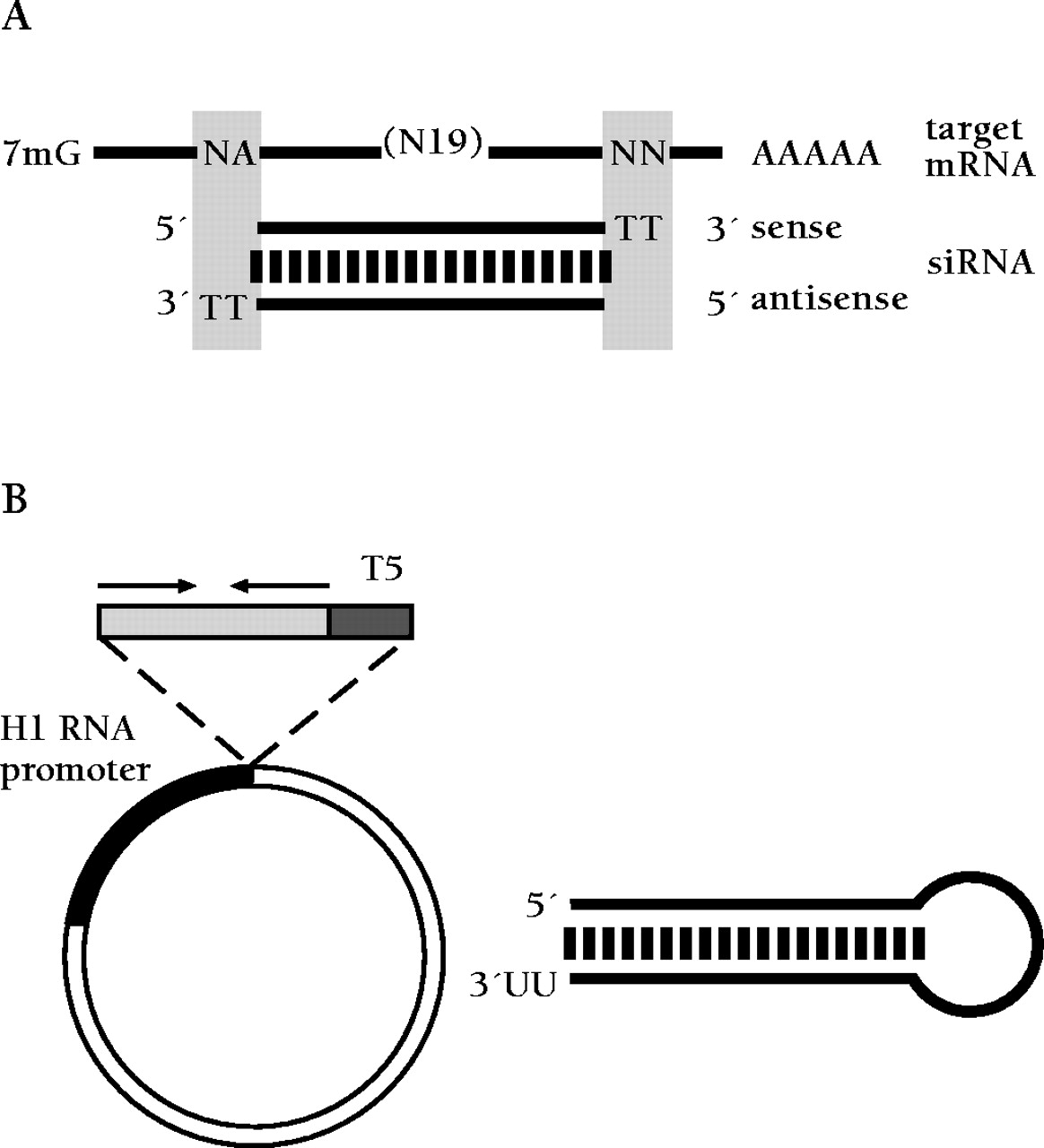 Methods for the delivery of siRNAs to somatic mammalian cells. (A) Synthetic 21-nt siRNA duplex prepared by chemical synthesis (23) aligned to a target mRNA. Target regions are selected such that siRNA sequences may contain uridine residues in the 2-nt overhangs. Uridine residues in the 2-nt 3′-overhang can be replaced by 2′-deoxythymidine without loss of activity, which significantly reduces costs of RNA synthesis and may also enhance nuclease resistance of siRNA duplexes when applied to mammalian cell (7). (B) Plasmid-based expression of short hairpin loops which give rise to siRNAs in vivo (11). The polymerase III promoter of H1 RNA (human RNase P RNA) drives the transcription of a nineteen-base-pair/nine-nucleotide-loop RNA hairpin. The transcription is terminated by the encounter of a polythymidine tract (T5) after the incorporation of two to three uridine residues encoded by the T5 element. Northern blot analysis showed that the hairpin RNAs were processed to siRNAs.
