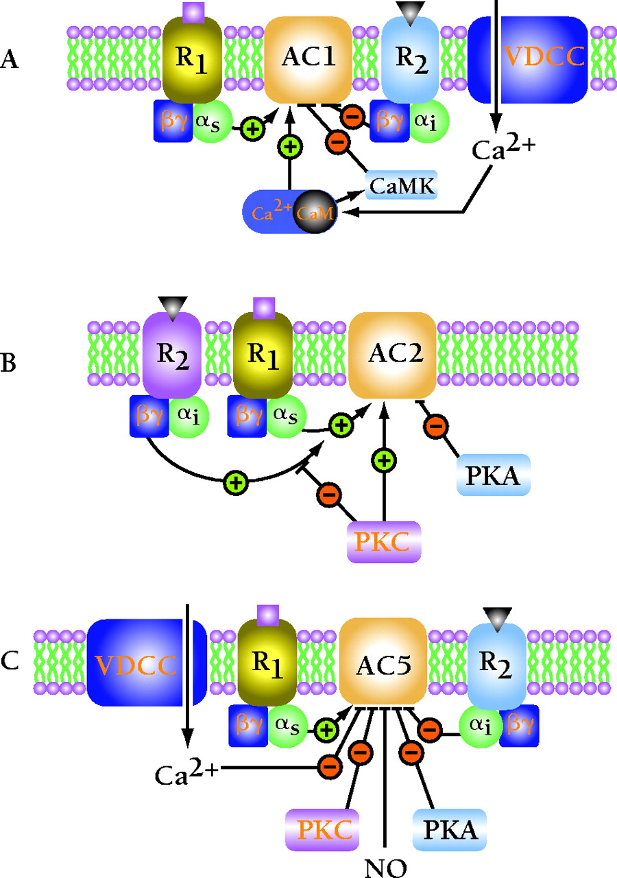 Multiple modes of regulation of adenylyl cyclase isoforms. (A) The pattern of regulation of AC1 as illustrated is representative also for AC3 and AC8. R1 represents a G protein–coupled receptor, such as the glucagon or β2-adrenergic receptor, that couples to the stimulatory G protein Gαs. R2 represents a G protein–coupled receptor, such as the muscarinic M2 or α1-adrenergic receptor, that couples to the inhibitory G protein Gαi. (B) The pattern of regulation of AC2 as illustrated is representative of the regulation of AC4 and AC7. Note that Gβγ regulation of AC2 is dependent on Gαs co-activation and does not activate AC by itself. PKC can use AC as a substrate, resulting in elevation of basal activity and inhibition of the Gβγ superactivation. (C) The pattern of regulation of AC5 is representative also of AC6. (PKA, protein kinase A; PKC, protein kinase C; CaM, calmodulin; CaMK, calmodulin-dependent kinase; NO, nitric oxide; VDCC, voltage-dependent Ca2+ channel.)