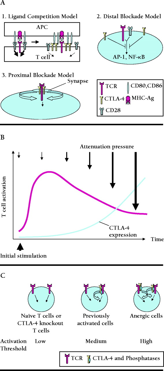 A. Three models for T cell inhibition by CTLA-4. 1. Ligand Competition Model wherein CTLA-4 can successfully compete with CD28 for CD80 and CD86 binding because of CTLA-4’s stronger avidity. 2. Distal Blockade Model wherein CTLA-4 inhibits distal pathways of TCR–CD28 signaling. 3. Proximal Blockade Model wherein CTLA-4 is recruited to the immunological synapse and blocks early signal transduction via the TCR. B. Attenuation model: In single T cells, CTLA-4 is synthesized during the time course of T cell activation and is recruited to the T cell surface. As a consequence, the T cell signal is attenuated and T cell activation is inhibited. C. Threshold model: In the absence of CTLA-4 (naïve cells and CTLA-4 knockout cells), the minimal requirement for T cell activation is very low. However, once CTLA-4 is induced (e.g., in previously activated cells or anergic cells), CTLA-4 is recruited to the immunological synapse where it increases the activation threshold either at the level of antigen specific (TCR) or co-stimulatory (CD28) signals.