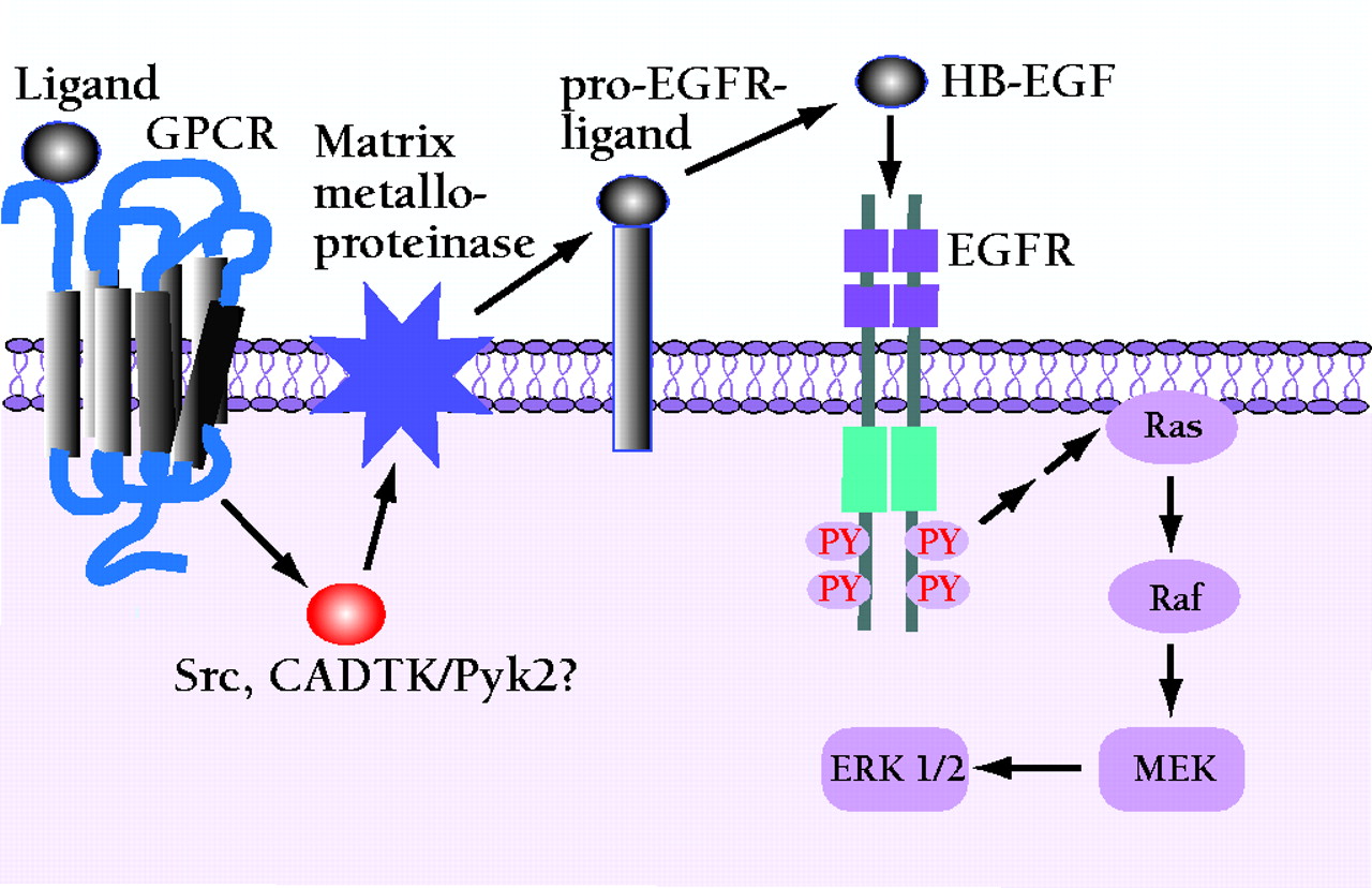 Signaling model of EGFR transactivation by crosstalk with a G protein-coupled receptor (GPCR). A mechanistic signaling model is described for heterologous GPCR coupling to an EGFR-dependent activation of the Ras/mitogen-activated protein kinase (MAPK) pathway (1). GPCR ligand-specific binding activates GPCR-Src- or calciumdependent tyrosine kinase- (CADTK, or Pyk-2) -dependent intracellular signals that promote the release from the cell surface of pro-HB-EGF through the matrix metalloproteinase-mediated proteolytic cleavage of this and other EGF-like growth factor precursors. Free, active HB-EGF binds to EGFR, leading to transactivation of the EGFR.