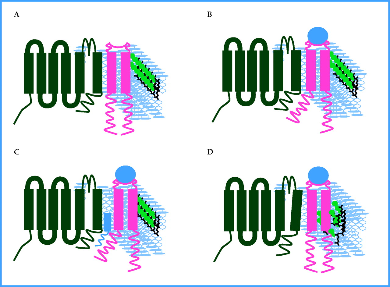 Putative models of sigma receptor modulation of ion channels. The plasma membrane is diagrammed to contain an idealized voltage-dependent ion channel (black) in close proximity to a sigma receptor (pink). The phopsholipid bilayer is depicted in blue and cholesterol molecules are green. When the unbound receptor and ion channel (as shown in A) binds to a ligand (blue circle), a conformational change occurs in the transmembrane or intracellular domains (or both) of the sigma receptor so that channel accessibility is either directly (as in B) or indirectly (as in C) regulated. Alternatively, ligand binding may result in local changes of cholesterol structure due to the activity of, or binding to, sterol isomerase-like sequences in the sigma receptors (D).