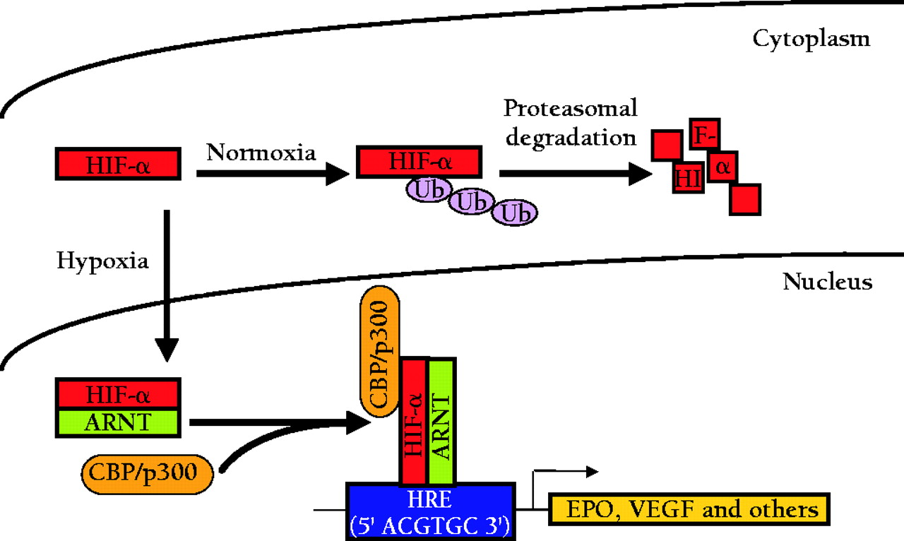 Hypoxia-inducible gene regulation by HIF-a. In normoxia, HIF-α is transcriptionally inactive and is rapidly degraded by the ubiquitin (Ub) proteasome pathway. In hypoxia, HIF-α undergoes protein stabilization and translocation from the cytoplasm to the nucleus, where it dimerizes with ARNT and associates with the transcriptional co-activators (as exemplified by CBP/p300) to induce the transcription of HRE-associated genes, such as erythropoietin (EPO) and vascular endothelial growth factor (VEGF). See text for details. CBP, cyclic AMP response element binding protein- (CREB)-binding protein; HRE, hypoxia response element.