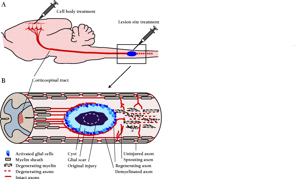 Experimental treatment of rat spinal cord injuries. A. Treatments are applied typically at the lesion site but can also be applied to the cell body. B. Cellular events typify a chronic spinal cord injury. Primary cellular damage spreads the insult to surrounding cells and creates secondary damage that can supersede the original injury. Secondary damage includes a central acellular fluid-filled cyst surrounded by a glial scar. In a typical crush injury, axons per se are often left uninjured, intact but partially demyelinated, or severed. Degeneration of axons and myelin occurs distal to the injury site. Treatment paradigms may promote regeneration of severed axons into or around the injury site, possibly into the distal spinal cord. In addition, treatments often promote the sprouting of uninjured axons into areas of deafferentation.