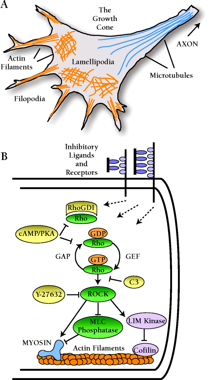 The growth cone: Features and inhibitory signaling pathways. A. A growth cone has distinct actin filament-based features, including distal, finger-like filopodia and central, fan-shaped lamellipodia. B. Schematic diagram of the Rho-signaling pathway in the growth cone, a possible pathway of convergence for numerous extracellular stimuli. Receptor activation somehow alters the balance of Rho-GEF and Rho-GAP activity so as to favor an increase in activated, GTP-bound Rho. Conversely, Rho activity can be down-regulated by RhoGDI sequestration to the cytoplasm, an effect promoted by intracellular cAMP/PKA elevation. Rho-GTP activates its downstream effector kinases, of which ROCK is depicted here. ROCK in turn has effects on several substrates that affect actin events that lead to growth cone advance or retraction. (GAP, GTPase activating proteins; GEF, guanosine nucleotide exchange factors; RhoGDI, Rho guanosine nucleotide dissociation inhibitor; ROCK, Rho-kinase; PKA, protein kinase A.)