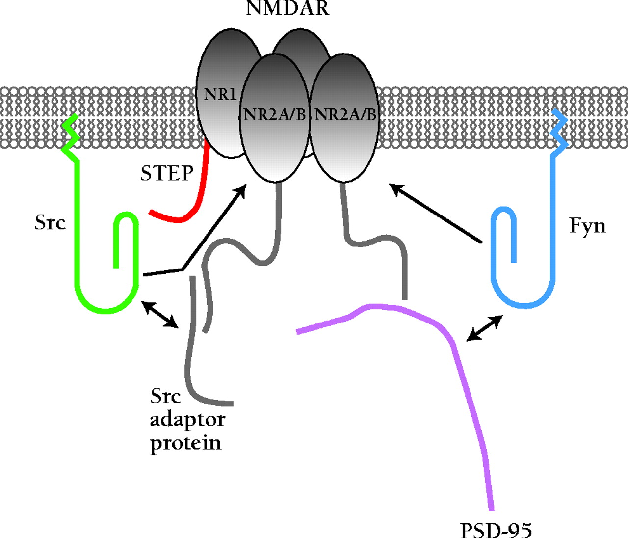 A model for the complex of NMDAR-STEP-Src/Fyn. TheNR1 subunit interacts with STEP, whereas the NR2A subunit interacts indirectly with Src and Fyn through the Src adaptor protein and PSD-95 (adapted from 19). Arrows indicate the mechanisms of regulation between proteins. STEP, striatal-enriched phospatase.