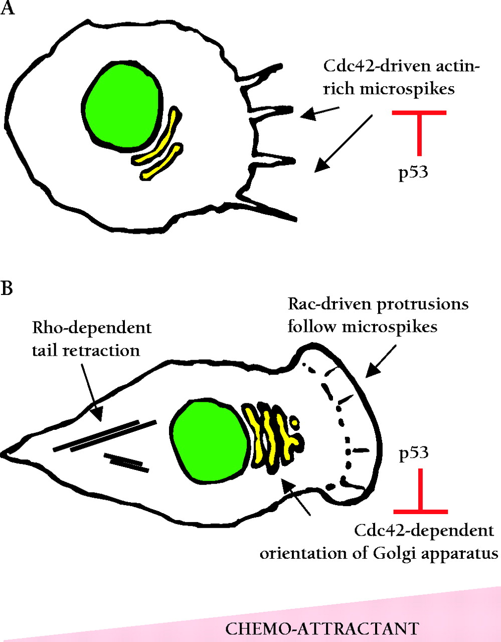Role of Rho proteins in cell motility. A. Chemotactic stimuli can promote Cdc42-dependent microspikes that can be suppressed by activation of p53. Microspikes can promote the formation of contacts between the cell and the substratum and cell spreading. B . Microspikes precede the formation of larger Rac1-dependent membrane protrusions that drive cell movement. Cdc42 activity is required to orient the Golgi apparatus in the direction of movement; the activation of p53 prevents this process. RhoA promotes the generation of the contractile force that is required to move the remaining part of the cell behind the protrusion.