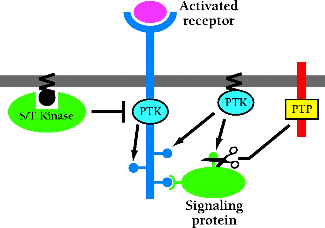 Compartmentalized regulation of receptor activities. Receptor-specific properties such as the pattern of receptor and signaling protein phosphorylation can be altered by endosome localization in a number of ways. Differential recruitment and/or activation of serine-threonine (S/T) kinases, which can phosphorylate the EGFR to inhibit its protein tyrosine kinase (PTK) activity, could change the extent and perhaps the specificity of substrate phosphorylation. Trafficking of other membrane-associated PTKs and receptor protein tyrosine phosphatases (PTPs) can yield higher or lower concentrations of these enzymes in endosomes versus the plasma membrane and provide additional regulation.