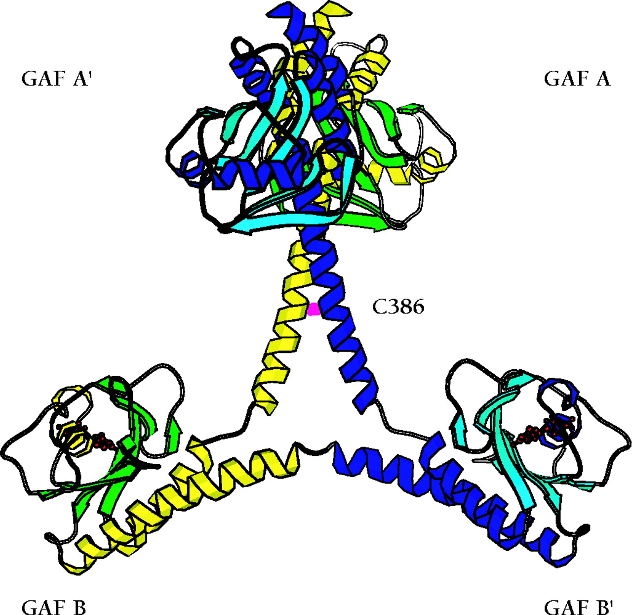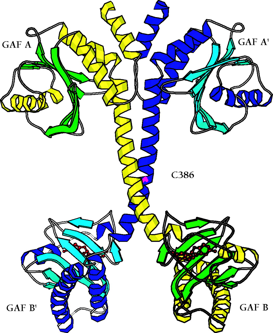 The backbone ribbon depicts the dimeric regulatory segment from PDE2A. A. The two GAF A domains interact to promote dimerization, and are adjacent to nine-turn helices that may be disulfide linked to each other at residues C386; at the C-terminal ends occur the GAF B domains that bind cGMP. B. View rotated ∼70 degrees with respect to the image in Figure 2A. Only the first seven turns of the nine-turn helices that intervene between the GAF A and GAF B sequences of each monomer are involved in dimerization. The GAF B domains are ∼65 angstroms apart. The overall dimensions of the dimerized regulatory segments are 105 by 92 by 71 angstroms. Beta sheets are colored in light blue and green; alpha helices in dark blue and yellow. Cyclic GMP is shown in red.