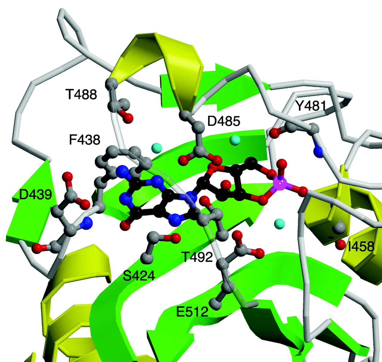 Detailed view of the cGMP-binding GAF B motif from mouse PDE2A. Shown are six side chains (D485, T488, T492, D439, S424, and E512) that make relatively close hydrogen bonds to the cGMP ligand, either directly or through one of three bound water molecules. In addition, the phenyl side chain of F438 stacks with the guanine ring, and two backbone amides (I458 and Y481) interact with the phosphate group. Beta sheets are colored green and alpha helices yellow. Cyclic GMP is shown in black. Side chains that interact with cGMP are shown in gray. Hydroxyl groups are in red and nitrogen atoms in blue. Water molecules are indicated in light blue.