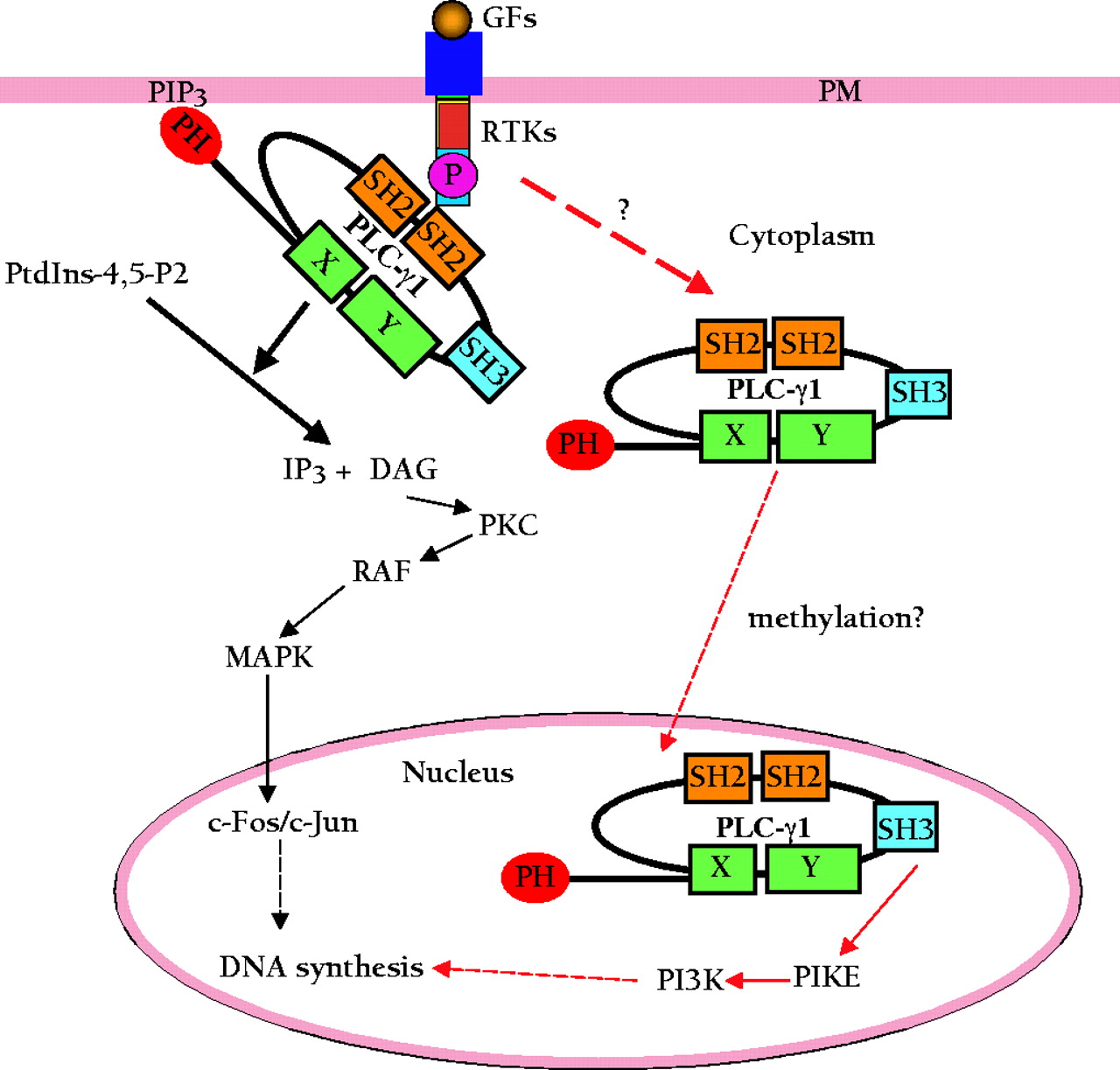 Two pathways depicting the molecular mechanisms by which PLC-γ1 mediates GF-induced cell mitogenesis. The red arrow indicates a guanosine nucleotide exchange factor (GEF) model [supported by (2)], and our speculation concerning methylation. The black arrow indicates a conventional phospholipase model that involves the PLC-γ1-dependent generation of DAG and IP3. GFs, growth factors; PM, plasma membrane; PI3K, phosphatidylinositol-3′ kinase; MAPK, mitogen-activated protein kinase.